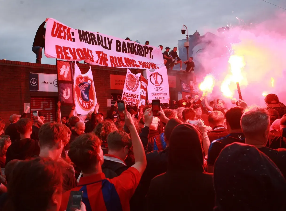 On the evening of Tuesday 15th July, the streets of South London echoed with the chants and fervor of hundreds of Crystal Palace supporters, united in their outrage over UEFA’s decision to demote their club from the Europa League to the Conference League. The protest, organized by the passionate Holmesdale faithful, saw fans march from Norwood Clocktower to Selhurst Park, brandishing banners, igniting red flares, and even graffiting the stadium walls with messages like “UEFA mafia.” This visceral display of anger was not just about a footballing decision but a broader stand against what fans perceive as the growing disconnect between the sport’s governing bodies and its supporters.