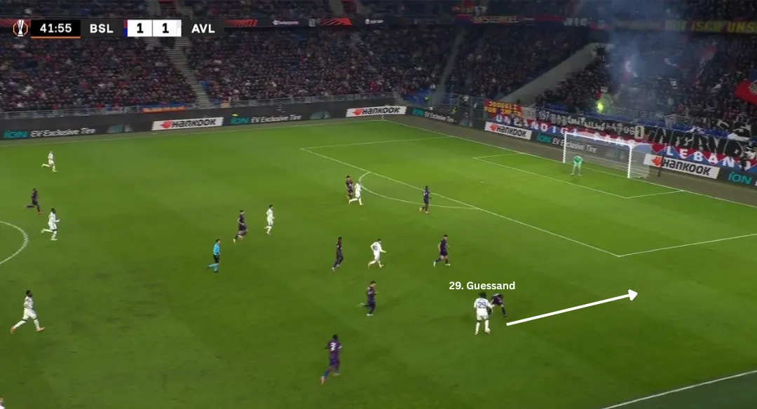 Although Guessand doesn't do much here, he makes quite a big impact by just having the ball on the wing. His eagerness to take people on, causes Basel to double up on him in this situation. This is the difference he offers compared to McGinn on the right flank, who plays more on the inside as he is left-footed.