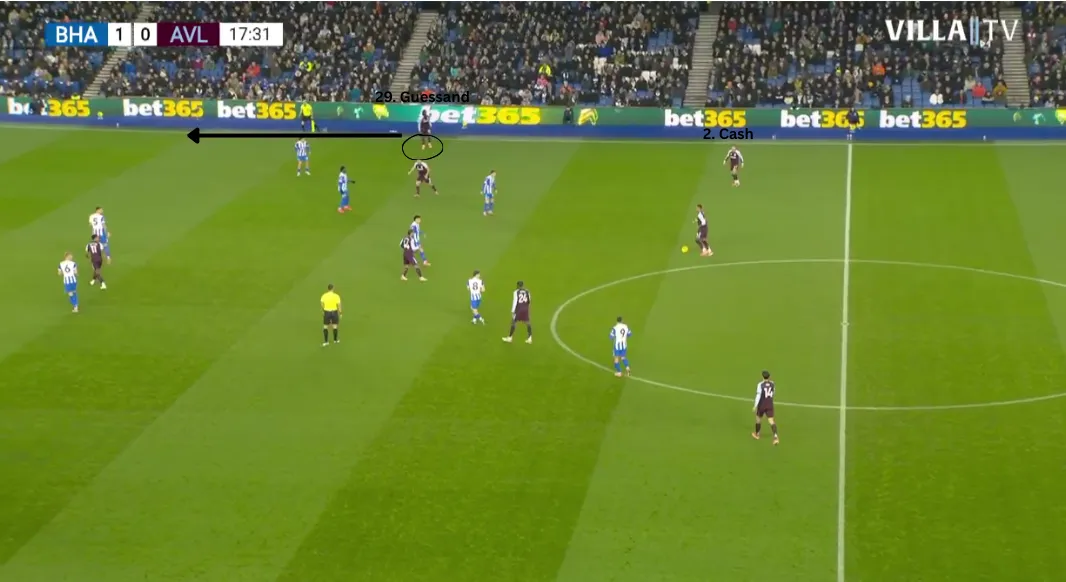 Against Brighton, we can see Guessand hugging the touchline when Villa have the ball. This drags the full-back with him creating space behind him for someone to run into. In the past, we have seen Watkins run into that space and Konsa play a long ball over the top, but on this occasion he doesn't.