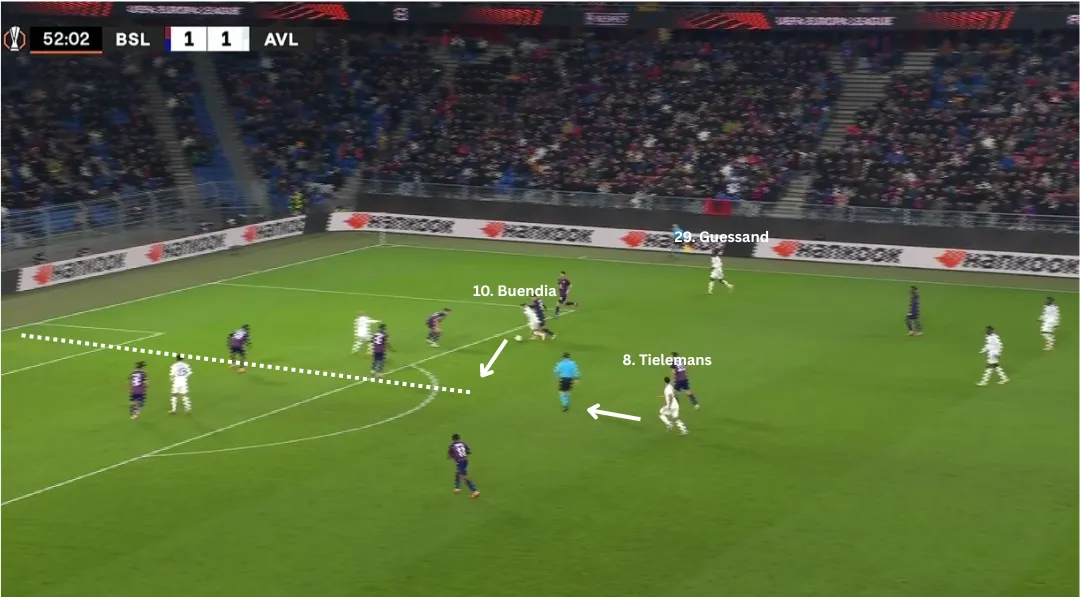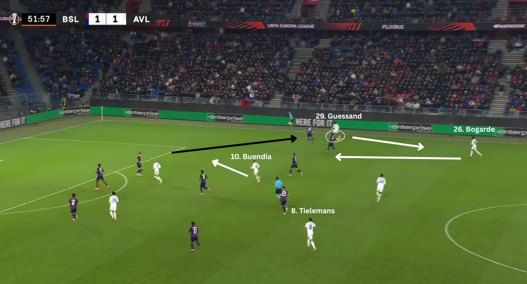 Early on in the second half, Villa get their second and it's largely due to Guessand's positioning. As he is now hugging the touchline, the full-back gets dragged out of position, enabling Buendía to run into space. The Basel winger doubles up on Guessand, so he passes the ball back to Bogarde, who then cuts the midfield with a pass to Buendía.