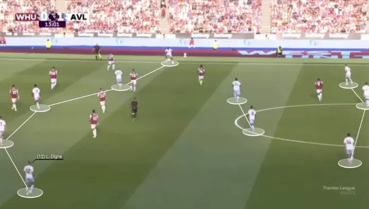 In this picture you can see that Digne's role is to stay high and wide, getting beyond the opposition's right-back and putt crosses into the box as well as cutting it back for players hovering on the edge. Players like Jacob Ramsey and John McGinn on the left-wing would come inside allowing him to do this, whilst also giving him a passing option in midfield.