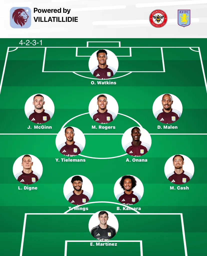 Emiliano Martinez returns from his suspension and is likely to slot back in goal, despite Bizot's strong debut. Andres Garcia has returned to training following his injury during pre-season and will probably make the bench. Ezri Konsa's red card against Newcastle means he will miss the game and Ross Barkley remains a doubt.
