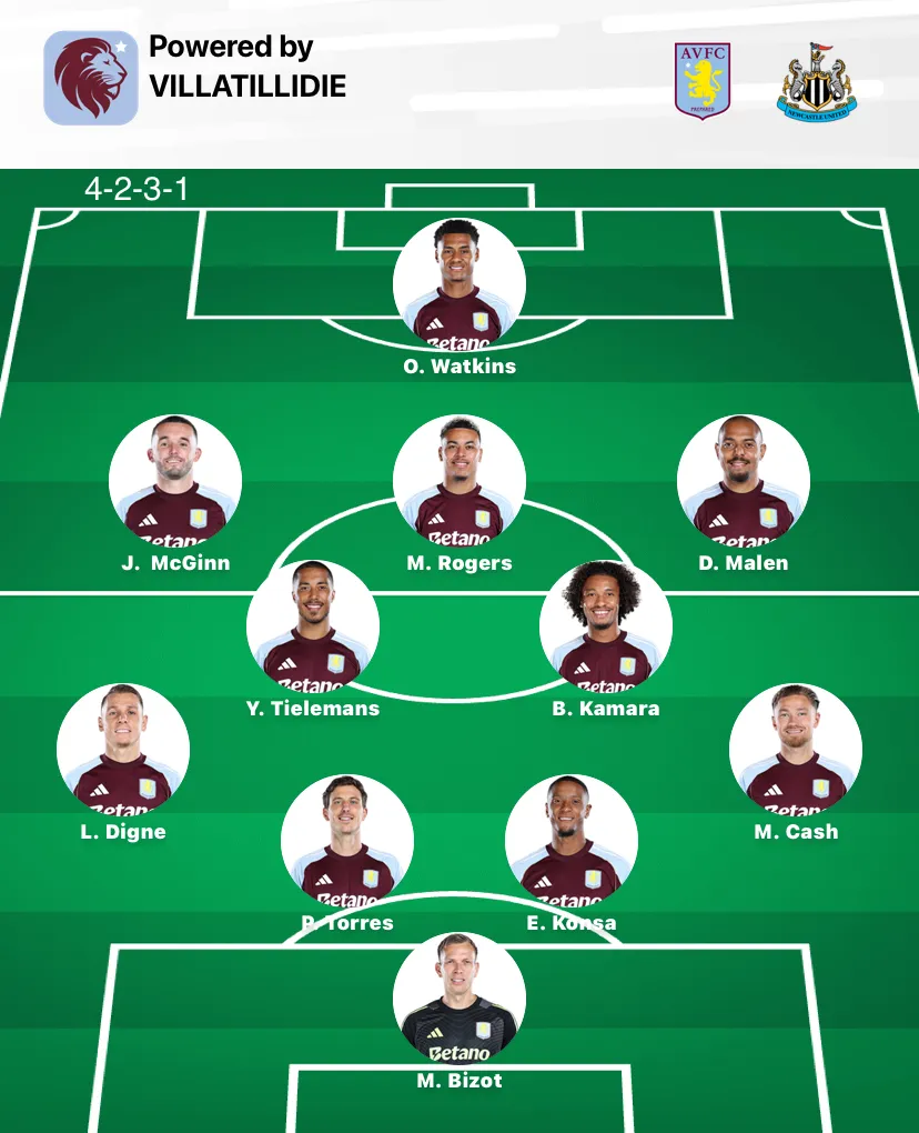 Villa will be without Jacob Ramsey and Leon Bailey as they both are in talks with Newcastle and Roma respectively about potential moves. Emiliano Martinez is suspended following a red card in the final match of last season against Manchester United. Both Rogers and Boubacar Kamara have been pictured in training despite picking up knocks in pre-season, so they look like they will start. It's probably a tossup between Lucas Digne and Ian Maatsen as to who starts at left-back, but following the trends of last season Digne may get the nod. There is a potential that Emiliano Buendia could start in the No 10 with Rogers shifting to the left-wing, after the Argentinian showcased his skills in pre-season.