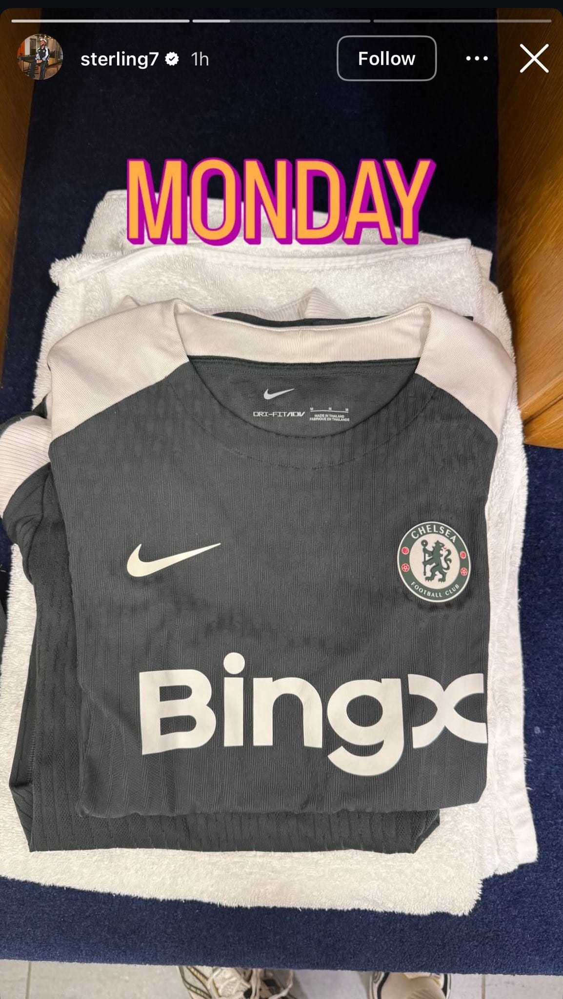 A second image, shared an hour later, features a folded Chelsea training kit with the "BingX" logo, a towel, and a bold "MONDAY" text, suggesting a personal training routine outside the main squad. This glimpse into his preparation has intrigued fans, highlighting his professionalism amid adversity.