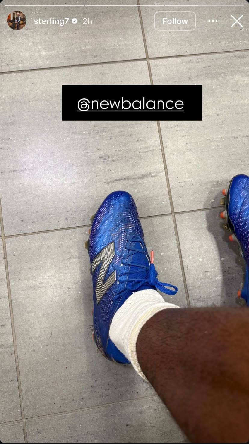The final photo, tagged New Balance zooms in on Sterling's fresh blue boots, signaling his readiness to stay fit.