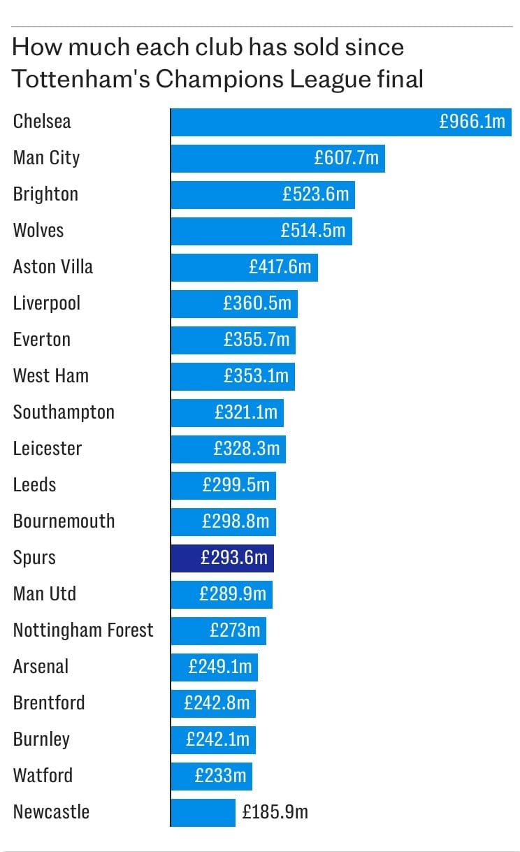 The other finalist, Tottenham, has seen £293.6m in sales. - Man Utd - £289.9m