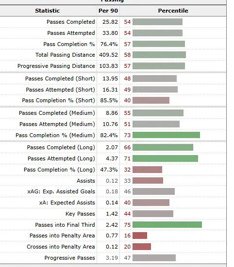 For an attacking midfielder in a struggling team, his pass completion rate is also pretty decent. Last season, his pass completion rate was around 76%, while his Progressive Passes rate was 3.19 - lower than you would want from an attacking midfielder.