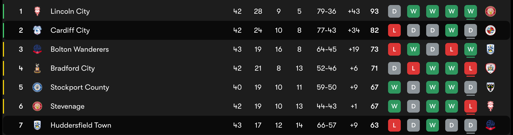 Cardiff’s cushion to the chasing pack remains significant: Bolton are third on 73 points from 43, with Bradford 2 points further back (42), meaning the Bluebirds still hold a healthy advantage in the race for automatic promotion despite dropping two points in West Yorkshire.